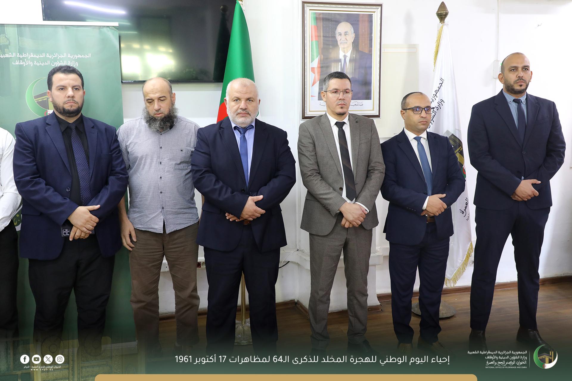 وفي هذا الإطار، قام صبيحة اليوم الخميس 24 ربيع الثاني 1447هـ الموافق لـ16 أكتوبر 2025م، في تمام الساعة 11:00 إطارات وعمال الديوان الوطني للحج والعمرة بالوقوف دقيقة صمت ترحماً على أرواح شهداء مظاهرات 17 أكتوبر 1961، تخليداً لهذه الذكرى الوطنية الأليمة.