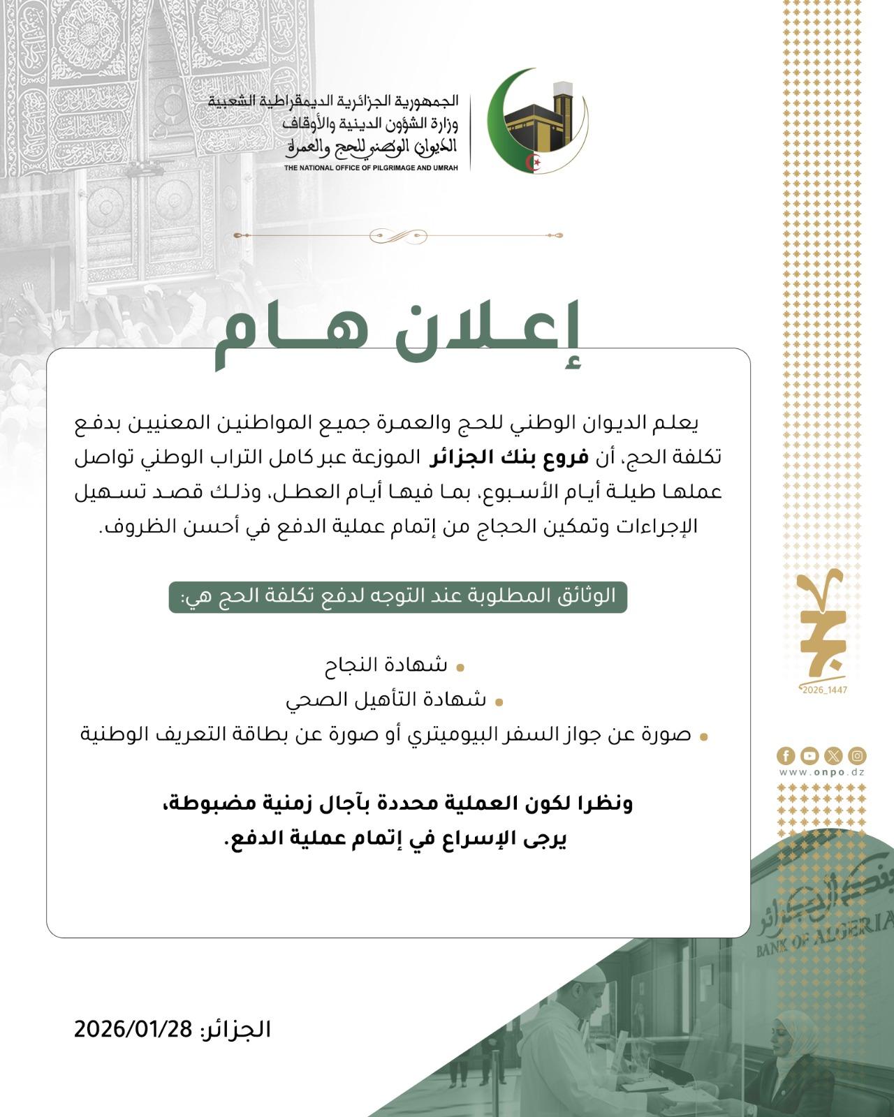 إعلان | 16/1447 | عمل مستمر لفروع بنك الجزائر لاستقبال الحجاج الميامين